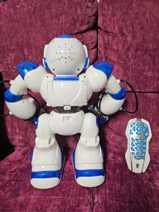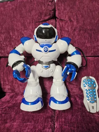 Robot teledirigido de color blanco y azul, diseñado para niños. Incluye un mando a distancia para su control. - Diseño futurista. - Brazos articulados. - Mando a distancia con botones de control.