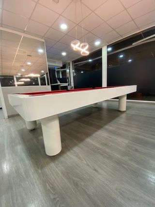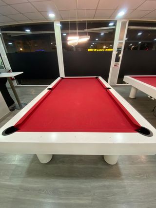 Mesa de billar con un diseño moderno y elegante. - Estructura blanca. - Tapete de juego rojo.