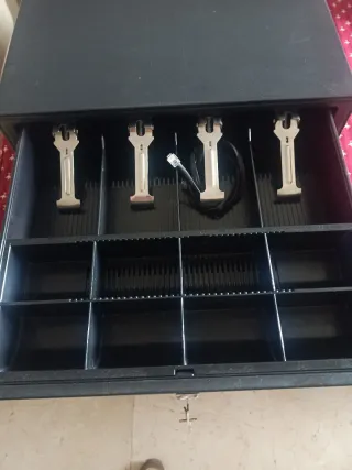 Caja metálica para organizar billetes y monedas en tu negocio. Cuenta con compartimentos para una fácil distribución. - Bandeja superior con clips para billetes. - Múltiples divisiones para monedas y billetes.