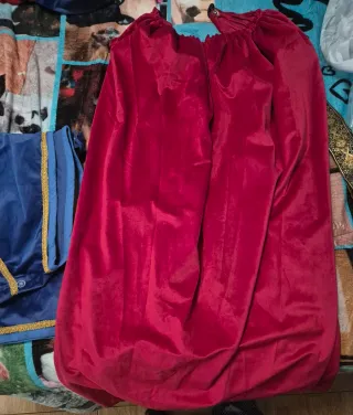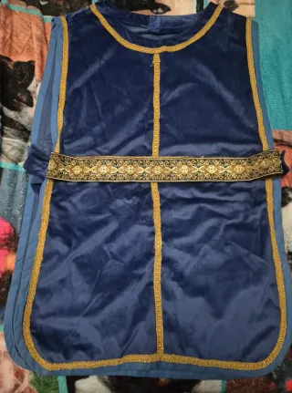 Este disfraz de príncipe es perfecto para fiestas temáticas o eventos especiales. El tejido azul aterciopelado le da un toque regio. - Color azul. - Ribetes dorados. - Cinturón decorativo con motivos dorados. - Capa roja aterciopelada aterciopelado. - espada pequeña de madera. Todo confeccionado a mano. Es de una talla M Y la Camisa es L para que quedara mas olgada.