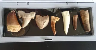 Conjunto de 7 dientes de los principales dientes fósiles de reptiles marinos, tiburones extintos, y Pterópodos semiacuáticos como el Mosasaurio, Otodus, Squalicorax, Onchopristis, Enchodus, Plesiosaurus y Spinosaurus, de unos 5 cm de longitud, y procedente de Marruecos. Presentado en un marco flotante expositor