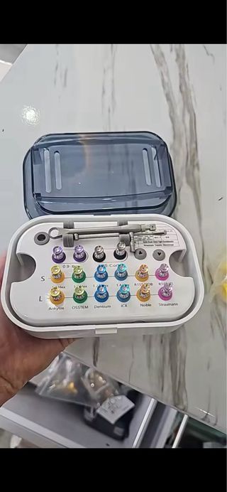Kit de destornilladores para prótesis de implantes dentales universal. Incluye varios destornilladores y accesorios. - Estuche organizador con tapa transparente. - Mango ergonómico para un mejor agarre.