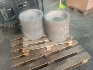 Se venden 3 pares de ruedas para plataforma Haulotte. Están apiladas sobre un palé de madera. - Ruedas de goma con banda de rodadura. - Centro metálico.