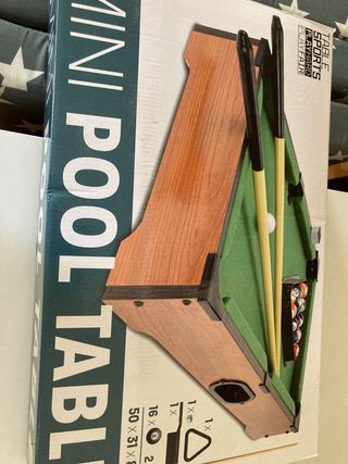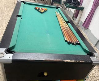 Mesa de billar pequeña, ideal para jugar en casa. Incluye dos tacos y un juego completo de bolas. Está en buen estado, lista para disfrutar de divertidas partidas. - Medidas compactas, perfecta para espacios reducidos. - Dos tacos de madera incluidos. - Juego completo de bolas de billar.