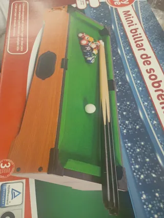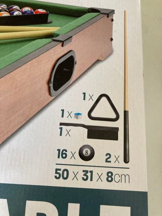 Mesa de billar en excelentes condiciones. Es perfecta para jugar en casa o llevarla a cualquier parte. - Incluye dos tacos. - Ideal para niños i niñas pequeños/as. - Tiene 16 bolas de billar y una bola blanca. - La mesa está en muy buen estado.