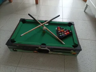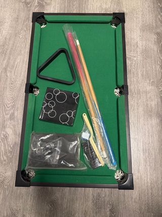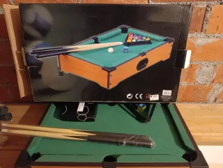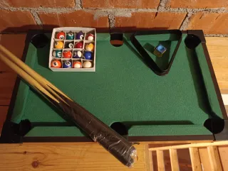Mesa de billar de tamaño reducido, ideal para los más pequeños de la casa. Incluye todos los accesorios necesarios para empezar a jugar. - Mesa de billar con paño verde. - Dos tacos de madera. - Juego de bolas de billar. - Triángulo para colocar las bolas. - Cepillo para el paño.