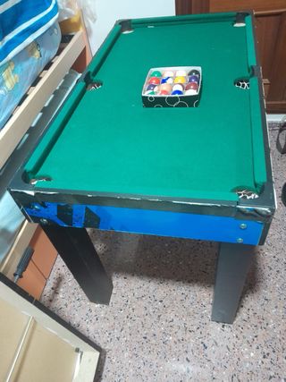 Mesa de billar infantil con diseño divertido. - Patas de color azul. - Incluye bolas y tacos.