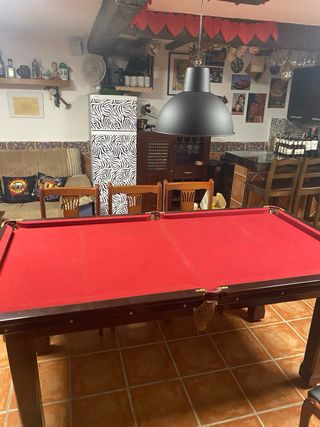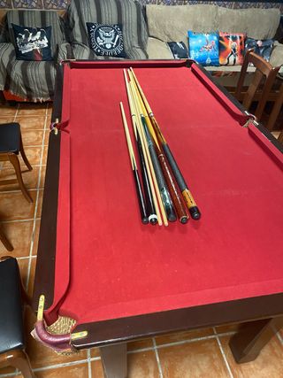 Mesa de billar con superficie de pizarra. - Estructura robusta. - Tapete de color rojo nuevo. - Mesa de fabricación inglesa. Madera maciza -Pizarra de una sola pieza -Se incluyen los tacos y un juego de bolas - Tapa de madera para usar de mesa comedor