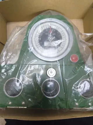 Reloj dispensador de billar con esfera analógica y detalles metálicos. - Diseño en color verde. - Esfera con múltiples escalas y manecillas. - Incorpora un botón rojo y un mecanismo de cierre. - Dos círculos frontales de gran tamaño.