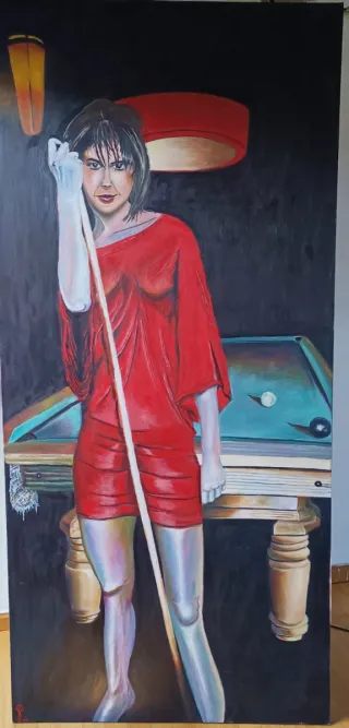 Pintura al óleo de una mujer con un vestido rojo junto a una mesa de billar. - Lienzo de gran tamaño. - Representación artística. - Tonos oscuros y vibrantes.