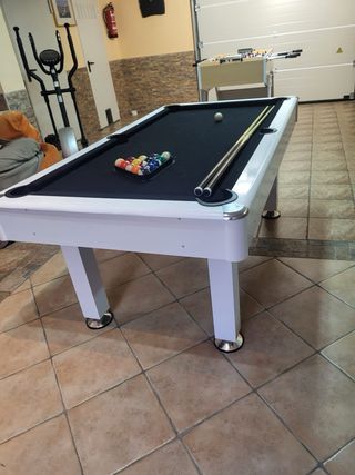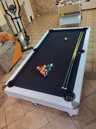 Mesa de billar en oferta. Ideal para disfrutar en casa. Medidas 183 x 102 x 90 cm - Diseño moderno en color blanco. - Superficie de juego negra. - Incluye taco y bolas El tapete esta un poco roto Un lateral esta roto pero funciona igual no incumbe en nadaq