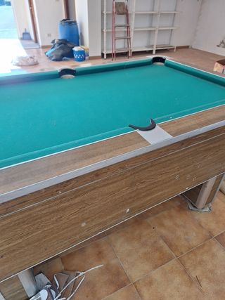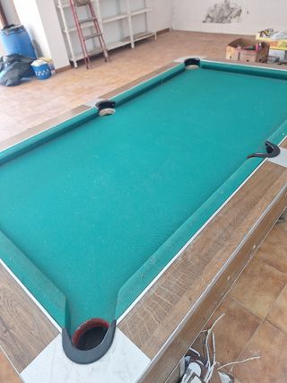 Mesa de billar americano en buenas condiciones. Ideal para jugar en casa o en un local. - Medidas aproximadas: (Añadir medidas si se conocen) - Color verde de la superficie de juego. - Madera en buen estado, aunque con señales de uso. Tapiz nuevo la madera esta bastante bien tiene algún roce lleva triángulo bolas billar y 4 palos ideal bar