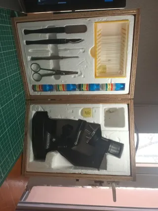 Microscopio educativo con todos sus accesorios originales, guardado en su maletín. - Incluye pinzas, tubos de ensayo, portaobjetos y más. - Maletín azul resistente para su transporte y conservación.