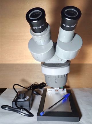 Microscopio estereoscópico de aumentos fijos. Es pequeño pero está bien fabricado y en buen estado de uso, con la óptica casi como nueva. El precio anunciado incluye un par de oculares (a elegir de entre los 3 pares de la 2a foto), y todo lo que muestran las demás fotos, incluso el soporte de aluminio y resina con un led potente de 6 V regulable, hechos a medida del microscopio (se ven parcialmente en las fotos). Hace 10 o 20 aumentos girando el cuerpo inferior del aparato. Aparato muy útil y divertido, ideal para niños espabilados, coleccionistas, etc.
