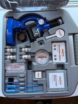 Kit de microscopio Eduland Deluxe con accesorios. - Incluye microscopio azul. - Varias muestras y portaobjetos. - Pipetas y recipientes de almacenamiento.