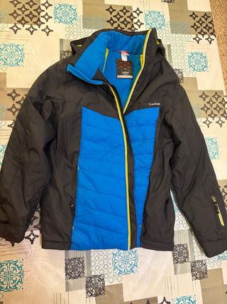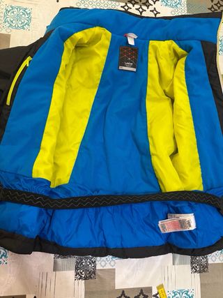 Chaqueta para la nieve en color azul y negro. Talla 12 años. - Diseño acolchado en la parte frontal. - Cremallera central de color amarillo. - Capucha integrada.