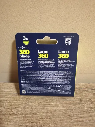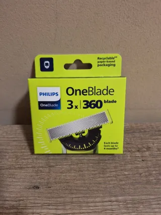Recambios para Philips OneBlade. Tengo más modelos en mi perfil - Incluye 3 cuchillas OneBlade 360. - Cada cuchilla dura hasta 4 meses. - Empaquetado de papel reciclable.