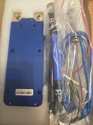 Placa de gestión de batería Daly con carcasa azul. - Conexiones metálicas doradas. - Tornillos de fijación negros. - Etiqueta con código de barras y número de serie.