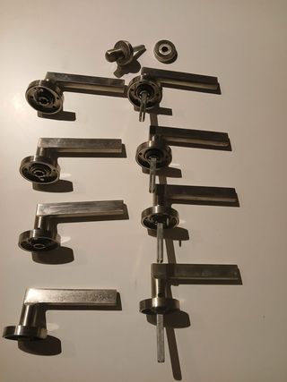 4 pares de manillas para puertas fabricadas en aluminio. Incluyen sus rosetas. - Regalo condena de puerta. - Material: Aluminio. - Diseño moderno.