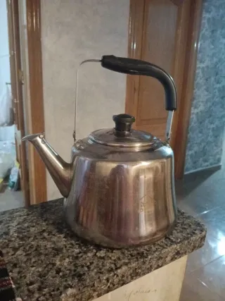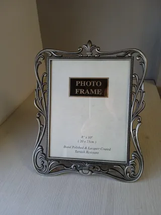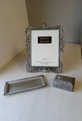 Conjunto de tres piezas decorativas en metal. - Marco de fotos 20X25. - Bandeja rectangular con borde decorado. - Joyero forrado interiormente. Buen estado, la bandeja más deteriora, pero en muy buenas condiciones como se aprecia en las fotos.