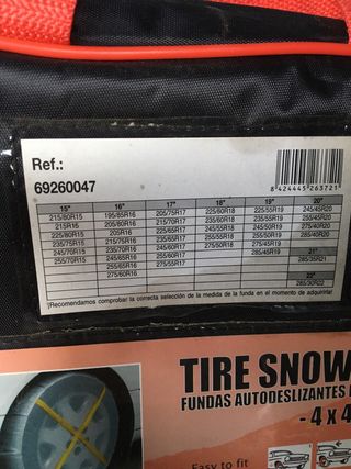 Fundas textiles para nieve y hielo de la marca DANOKAR, modelo 69260047. Diseñadas para vehículos 4x4 y furgonetas. - Fabricación 100% textil. - Fácil y rápida instalación. - Sin ruido ni vibraciones. - No deterioran los neumáticos. - Uso exclusivo sobre nieve o hielo. - Incluye 2 pares. - Velocidad máxima: 50 km/h.