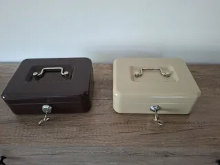 Conjunto de dos cajas fuertes metálicas, una en color beige y otra en marrón. Ambas incluyen su llave. Una 5 las dos 10 Medidas 19x15x7