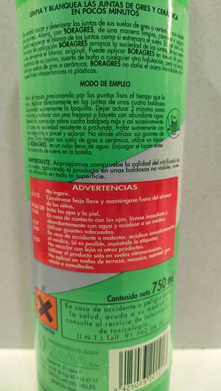 Limpiador blanqueante para juntas de suelos de gres y cerámica. Limpia y desincrusta la suciedad fácilmente en juntas de suelos de gres y cerámica. Boragres de la marca Disaba s.l. También puede usarse como fregasuelos. Contenido: 750 ml. El precio es por unidad. Dispongo de varias unidades. No incluye el transporte.