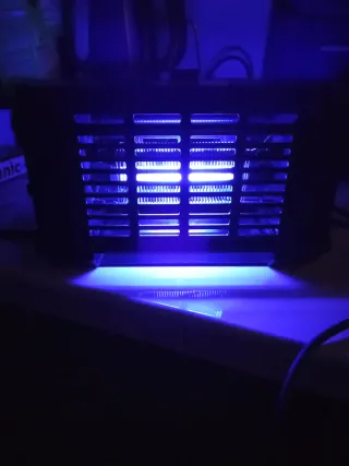 Lámpara eléctrica diseñada para atraer y eliminar insectos voladores. - Carcasa de plástico negro. - Rejilla protectora frontal. - Asa metálica superior para transporte. - Interruptor lateral de encendido/apagado. - Cable de alimentación con enchufe europeo.