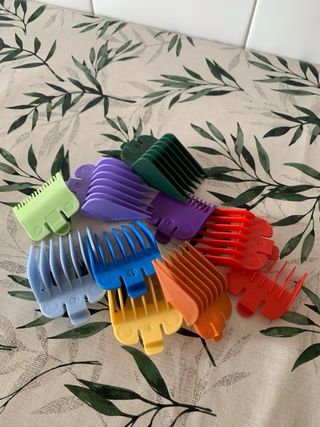 Conjunto de peines guía para cortapelos, ideales para lograr diferentes longitudes de corte. - Incluye peines de varios tamaños y colores. - Diseñados para adaptarse a la mayoría de cortapelos. - En perfecto estado y sin uso previo