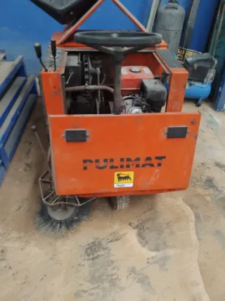 Máquina barredora de la marca Pulimat, ideal para limpieza de suelos. - Color naranja. - Ruedas y cepillo. - Logo de Agip.