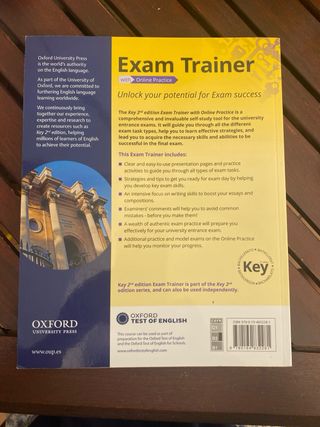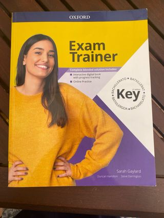 Libro de texto Exam Trainer, 2ª edición, con soluciones. Incluye libro digital interactivo con seguimiento del progreso y acceso a práctica online. Está en muy buen estado. - Libro guía para Bachillerato. - Incluye soluciones (Key). - Edición en inglés.