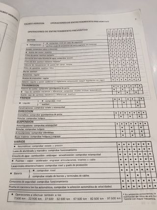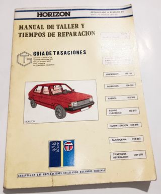 Manual de taller y tiempos de reparación para Talbot Horizon, actualizado a Febrero de 1984. Esta guía de tasaciones incluye información sobre suspensión, dirección, frenos, equipo eléctrico, climatización y carrocería. El manual está en buen estado. - Guía de tasaciones incluida. - Edición de Febrero de 1984. - Manual en español.