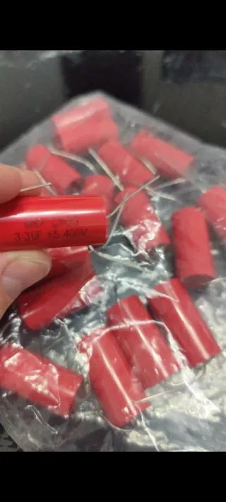 Lote de condensadores bipolar de película roja, modelo MKP CYG, dispongo de algunos mas, pregunten sin compromiso. - Capacidad: 2.2uF 3.3uF 4,7uF - Tolerancia: ±5%. - Voltaje máximo:250v y 400V.