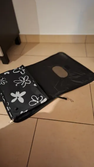 Transportín para mascotas con un bonito estampado de flores blancas sobre fondo negro. Es ligero y fácil de llevar. - Diseño con flores blancas. - Malla transpirable en los laterales. -Talla M (hasta 6 kg Approx.) -Plegable