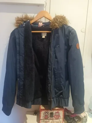 Chaqueta de la marca Roxy en color azul, ideal para niñas de 12 años. Es una prenda nueva, perfecta para mantener el calor. - Diseño con capucha y pelo sintético. - Forro interior de pelo suave. - Cierre de cremallera. - Detalle de logo en manga.