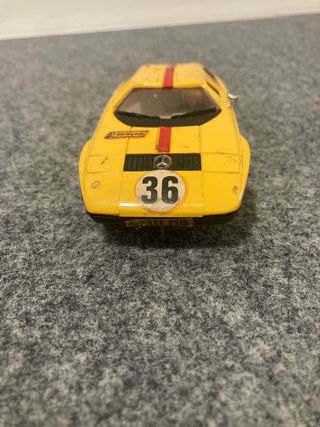 Coche de slot Mercedes C111 en color amarillo. - Diseño deportivo con franjas rojas. - Detalle de dorsal 36 en la parte frontal. - Insignia de Mercedes-Benz. - Neumáticos Dunlop.