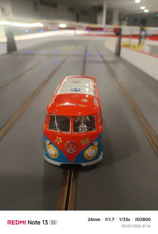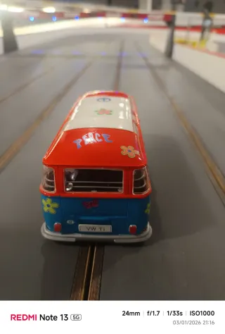 Réplica detallada de la icónica furgoneta Volkswagen T1, estilo hippie. - Con chasis 8001 scaleauto preparada para competir - Escala 1/24. - Diseño colorido con motivos florales y Love and Peace. - Detalles como mariposas y girasoles.