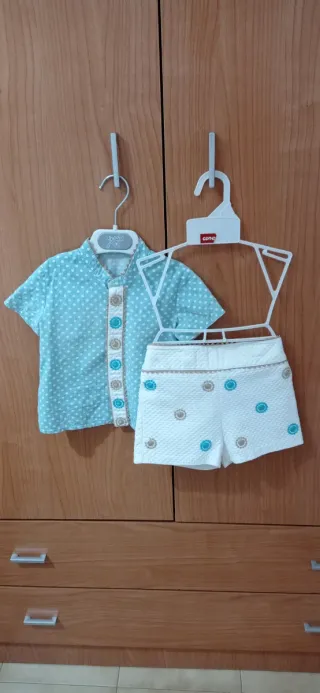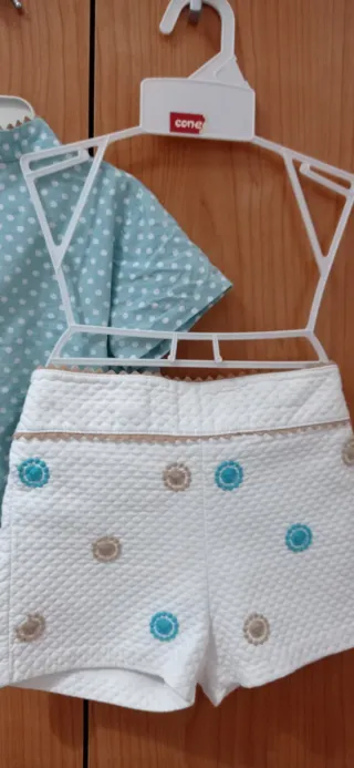 Conjunto de dos piezas para bebé, ideal para los días más cálidos. La camisa es de manga corta y el pantalón corto a juego. - Camisa azul con estampado de lunares blancos. - Pantalón corto blanco con detalles. - Cierre de botones en la camisa.