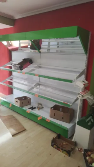 Se vende material de carnicería. - Estanterías metálicas con acabado verde. - Cajas de cartón para exposición. - Básculas de peso.