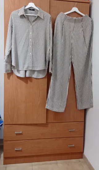 Conjunto de dos piezas a rayas, ideal para un look casual y elegante. La marca de mango -de talla M - Camisa de manga larga con cuello. - Pantalón ancho de talle alto.
