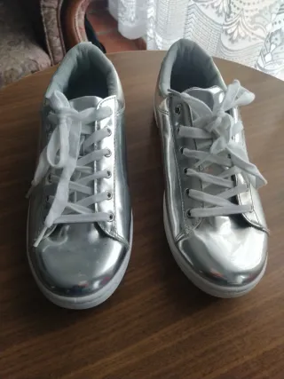 Zapatillas de estilo casual con un acabado brillante. - Color plateado. - Cierre con cordones blancos. - Suela blanca.