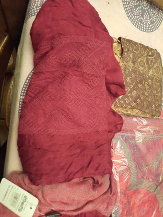 Preciosa colección de cuatro pañuelos. Son ideales para añadir un toque de estilo a cualquier atuendo. - Dos pañuelos de color granate, uno con textura lisa y otro con ligero relieve. - Un pañuelo marrón dorado con estampado floral. - Un pañuelo rojo con estampado multicolor.