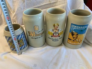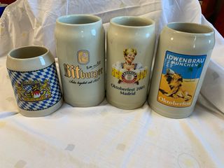 Conjunto de cuatro jarras de cerveza de cerámica con diseños variados. - Jarra con diseño de cuadros azules y escudo de Baviera. - Jarra Bitburger con logo y lema. - Jarra Erdinger Weissbräu con motivo de Oktoberfest Madrid 2001. - Jarra Löwenbräu München con león y motivo de Oktoberfest.