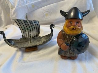 Conjunto de adornos de estilo sueco, que incluye un detallado barco vikingo y una figura de un guerrero vikingo. - Barco vikingo con vela plateada y detalles en negro. - Figura de vikingo con casco, barba y escudo.