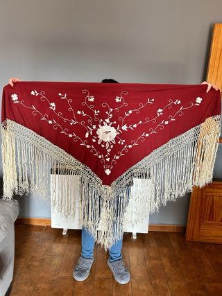 Precioso mantón de color granate con un delicado bordado floral en blanco. Los bordes están adornados con una elaborada puntilla y flecos largos. - Color: Granate - Diseño: Bordado floral - Adorno: Puntilla y flecos REBAJA DO