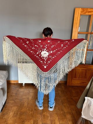 Mantón bordado floral con flecos