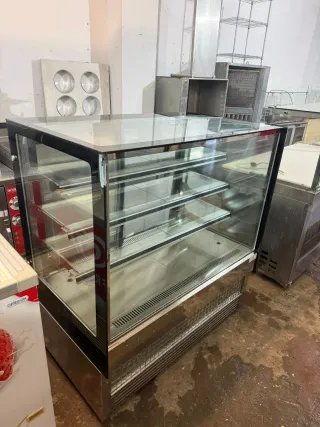 Mostrador expositor refrigerado con diseño curvo y cristal frontal. - Estructura de color beige. - Superficie de exposición de cristal. - Base con ruedas para fácil movilidad. - se paro funcionando hace dos años de ahi su precio