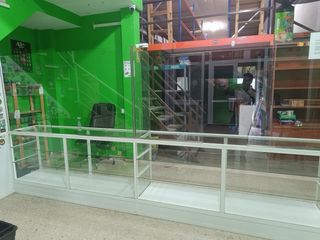 Mostrador de tienda con estructura de aluminio y mampara de cristal. -Se vende tal u como se ve en la foto, incluye puerta lateral, doble pantalla separada en el centro. - Diseño moderno y funcional. - Materiales resistentes para uso comercial.