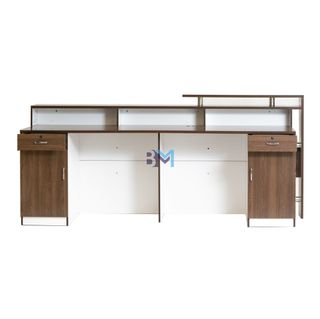 Mostrador de recepción con un diseño moderno y elegante, ideal para oficinas o negocios. - Acabado en madera oscura y blanco. - Detalle de logo 'BM' en el panel frontal. - Estructura metálica en los laterales.