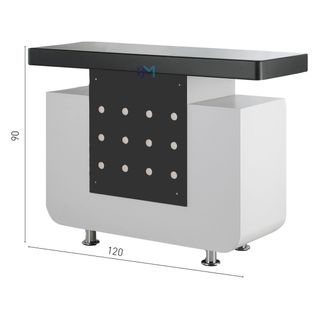 Mostrador de recepción moderno con un diseño elegante. - Base blanca con bordes redondeados. - Panel frontal negro con diseño de puntos. - Encimera superior negra. - Patas metálicas plateadas.